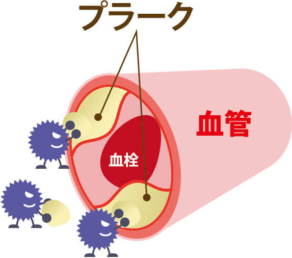 プラークとは、血管の内壁(血管内皮細胞)に、脂質(悪玉コレステロールなど)や炎症による物質が溜まり、ふくらみ(こぶ)のようになった状態のことをいいます。