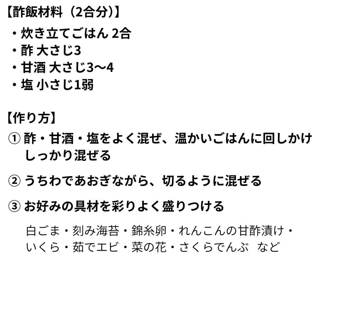 やわらかな酸味とやさしい甘みが具材の味を引き立てる、ひなまつり“風”ごはんです。