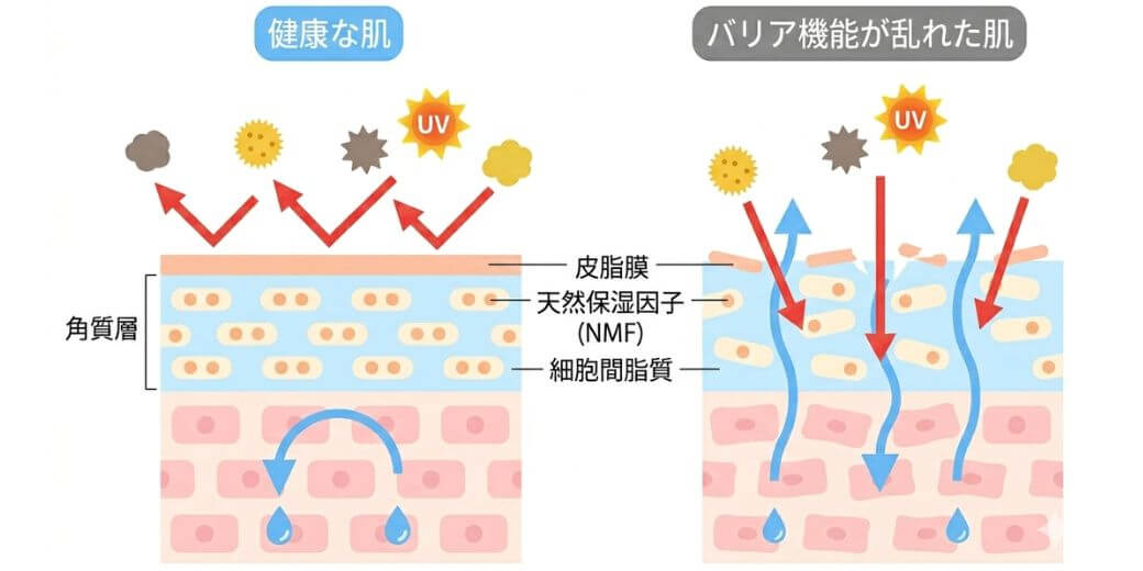 肌のバリア機能は「皮脂膜・細胞間脂質・天然保湿因子(NMF)」のバランスで保たれています。